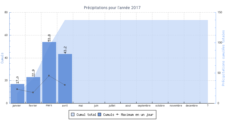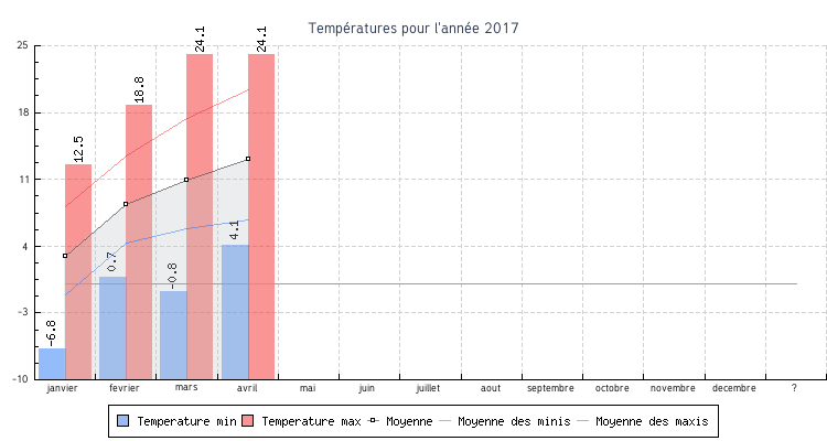 | avril | 4.1 °C | 6.8 °C | 24.1 °C | 20.4 °C | 13.1 °C | 2.7 km/h | 31.3 km/h | 136 |
